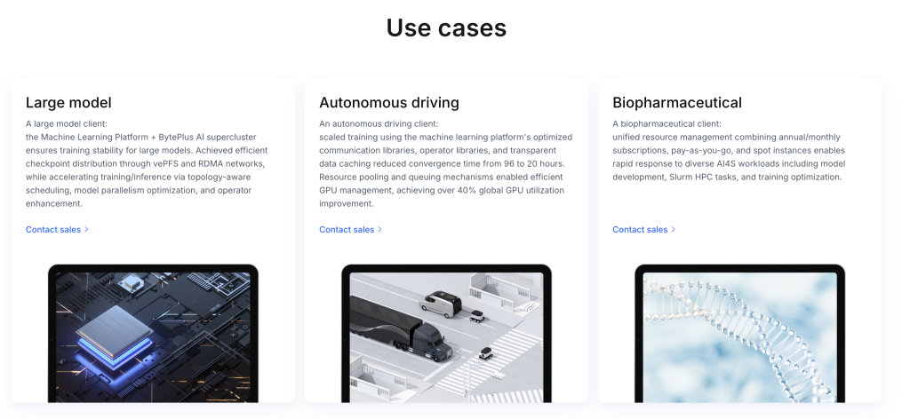 แพลตฟอร์ม ML ของ BytePlus มุ่งเน้นความเสถียรและประสิทธิภาพสำหรับ Training โมเดลขนาดใหญ่ ใช้สถาปัตยกรรมเครือข่ายความเร็วสูง ระบบไฟล์สำหรับ PFS และ Topology-aware Scheduling เพื่อให้การกระจายเช็คพอยต์ การขนานโมเดล และการสรุปผลทำได้รวดเร็วและคุ้มค่า