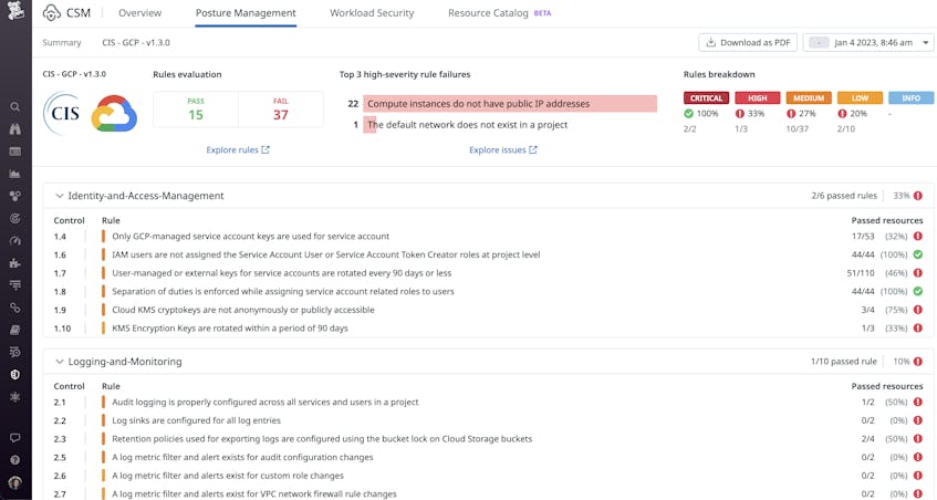 Datadog CSM มอบมุมมองที่สมบูรณ์แบบของสถานะ Resource ไม่ว่าสภาพแวดล้อมของคุณจะทำงานใน Google Cloud หรือใช้ประโยชน์จาก Multiple Clouds ด้วยการสนับสนุน Industry-standard frameworks เช่น PCI DSS, SOC 2, GDPR และ HIPAA คุณสามารถตรวจสอบได้อย่างง่ายดายว่าสภาพแวดล้อมระบบ Cloud ของคุณเป็นไปตามแนวทางปฏิบัติที่ดีที่สุด ที่สนับสนุนโดยการปฏิบัติตามข้อกำหนดและมาตรฐานความปลอดภัยล่าสุด