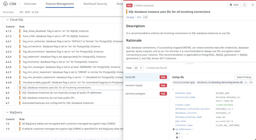 ในตัวอย่างก่อนหน้านี้ Datadog CSM ระบุ Google SQL database instances สาม Instances ที่ไม่ได้ใช้ SSL สำหรับการเชื่อมต่อที่เข้ามาทั้งหมด ซึ่งอาจทำให้ผู้โจมตีเข้าถึงและเปิดเผยข้อมูลที่ละเอียดอ่อน คุณสามารถลดปัญหานี้ได้โดยการอัปเดตนโยบายการเชื่อมต่อเพื่ออนุญาตเฉพาะการเชื่อมต่อ SSL เท่านั้น