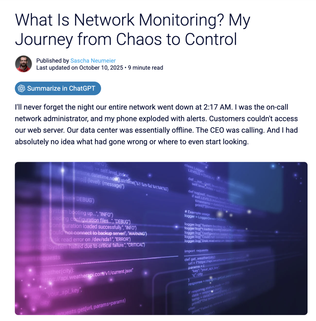 Neumeier, S. (2025, September 1). Proactive monitoring: Preventing IT problems before they impact your business. Paessler Blog. https://blog.paessler.com/proactive-monitoring-preventing-it-problems-before-they-impact-your-business Neumeier, S. (2025, October 10). What is network monitoring? My journey from chaos to control. Paessler Blog. https://blog.paessler.com/what-is-network-monitoring-my-journey-from-chaos-to-control Krome Technologies. (n.d.). Case study: Westgate School implement PRTG network monitoring solution. https://www.krome.co.uk/case-studies/prtg-case-study-westgate-school-implement-prtg-network-monitoring-solution/