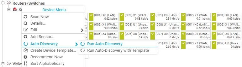 PRTG รองรับการมอนิเตอร์ผ่าน SNMP, WMI, Flow/Packet sniffing และ HTTP/SSH ได้ในแพลตฟอร์มเดียว รวมทั้งมีเซนเซอร์สำเร็จรูปจำนวนมากช่วยดึง health และ traffic ของอุปกรณ์มืออาชีพได้อย่างครบถ้วน เมื่อมีไซต์ใหม่หรืออุปกรณ์ในเครือข่ายใหม่ คุณสามารถใช้ Auto-Discovery ให้ PRTG สแกนและสร้างเซนเซอร์ที่เหมาะสมอัตโนมัติ เพื่อลดเวลาในการสร้างระบบ monitoring และพร้อมใช้อย่างรวดเร็ว