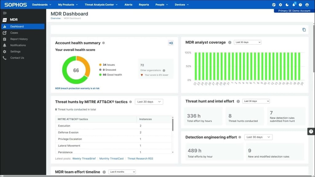 Sophos Secure Access Portfolio รวมอุปกรณ์และบริการสำคัญไว้ด้วยกัน ไม่ว่าจะเป็นไฟร์วอลล์ การเข้าถึงแบบ Zero Trust สวิตช์ ไวร์เลส หรือ SD-WAN ทั้งหมดสามารถจัดการผ่าน Sophos Central เพียงจุดเดียว ทีมไอทีจึงเห็นภาพรวมการใช้งานเครือข่าย อุปกรณ์ และผู้ใช้แบบเรียลไทม์ พร้อมบังคับใช้ Policy ได้อย่างสอดคล้องทั้งองค์กร เมื่อเครือข่ายกระจายทั้งในสำนักงานและบนคลาวด์ ความสามารถแบบ Centralized นี้ช่วยให้องค์กรลดความซับซ้อนจากการใช้หลายเครื่องมือ ลดภาระงาน และเพิ่มความเร็วในการตอบสนองต่อภัยคุกคามMDR และ XDR: การป้องกันและการตรวจจับขั้นสูง