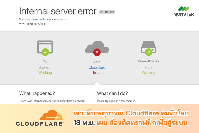 Cloudflare ล่มทั่วโลก 18 พฤศจิกายน 2025: เมื่อโครงข่ายหลักของอินเทอร์เน็ตสะดุดพร้อมกัน เช้าวันที่ 18 พฤศจิกายน 2025 ตามเวลา UTC โครงข่ายของ Cloudflare ผู้ให้บริการ CDN และโครงสร้างพื้นฐานอินเทอร์เน็ตรายใหญ่ของโลกเริ่มเกิดปัญหา ส่งผลให้ผู้ใช้งานจำนวนมหาศาลทั่วโลกเข้าเว็บไซต์และบริการออนไลน์ไม่ได้ และพบหน้า Error 5xx จาก Cloudflare แทน สิ่งที่เกิดขึ้นไม่ใช่การโจมตีไซเบอร์ หรือ DDoS ระลอกใหม่อย่างที่หลายคนคาด แต่กลับมาจาก “การเปลี่ยนแปลงสิทธิ์การเข้าถึงฐานข้อมูลภายใน” ที่ดูเหมือนเล็กน้อย ทว่ากลายเป็นจุดเริ่มต้นของความล้มเหลวแบบลูกโซ่ในระบบ Proxy ระดับแกนกลางของบริษัท Cloudflare ระบุชัดในรายงานว่า เหตุการณ์ครั้งนี้เป็นหนึ่งในเหตุขัดข้องที่เลวร้ายที่สุดนับตั้งแต่ปี 2019 และยอมรับว่า ช่วงเวลาที่ทราฟฟิกหลักของลูกค้าไม่สามารถผ่านเครือข่ายได้เลย ถือเป็น “บาดแผลใหญ่”...